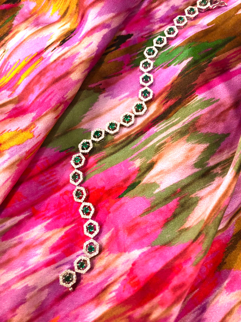This exquisite Deco Emerald and Diamond 18K White Gold Bracelet is the perfect addition to any look, bringing classic elegance and timeless beauty to your outfit. Crafted with fine emeralds and diamonds set in white gold, this bracelet will be a luxurious and sophisticated choice for any occasion.