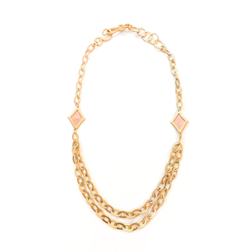 Illuminate your fall wardrobe. Twin diamond charms give way to a double tiered chain in vibrant yellow gold plate. The center of each diamond shape is rich with a rose gold plated hue. Features our trademark designer "S" hook closure for an extra hint of enchantment.