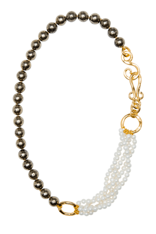 An elegant combination of dreamy Mother of Pearl meets stunning pyrite beads, creating a contrast that flawlessly sets off the gold plated hardware and signature clasp. The beauty of this piece is that it can be styled many ways, thanks to its multifaceted aesthetic appeal.