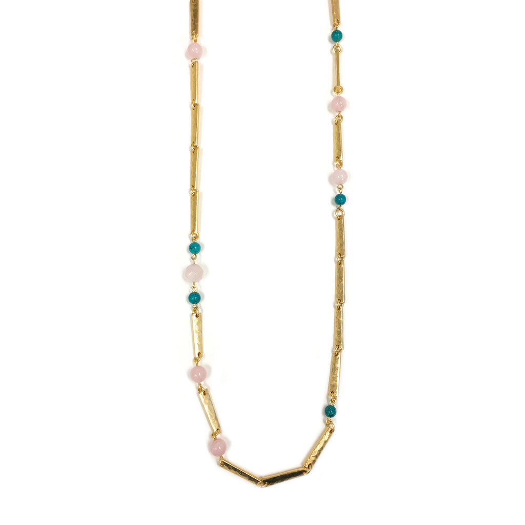 A lush mixture of pale pinks, blues and metallic golds dance along the length of this artisanal beaded necklace. Each bead is carefully placed to lead the eye and delight the senses. Layer with gold chains or wear alone for an elegant finishing touch.