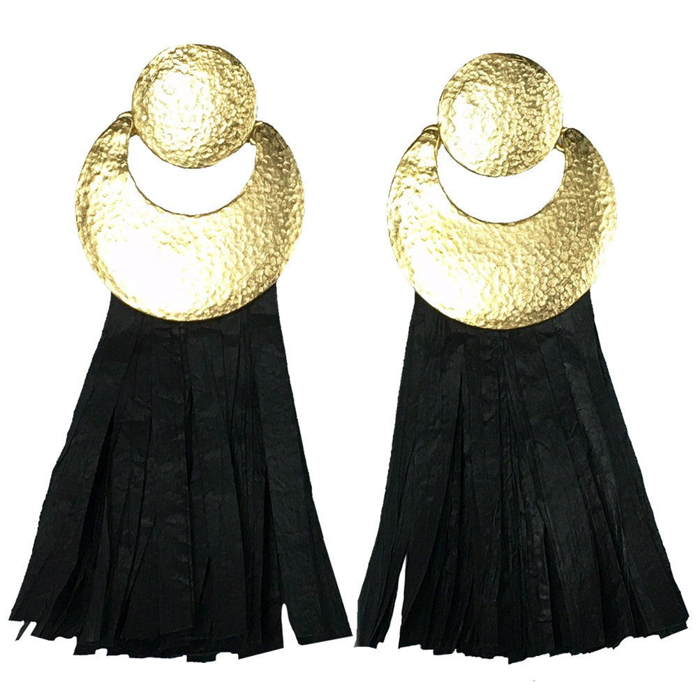 Straight off the runway: Introducing our exclusive Spring 2017 Christian Siriano runway show earrings. This fabulous shoulder-duster style will add some chic drama to your evening look with their bold size and soft curves. These hand hammered, 24k gold dipped, statement earrings come with 4" inch black raffia fringe.