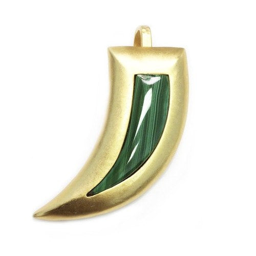 A lavish nod to nature's beauty and civilizations past. This stylized gold plated pendant is both luxurious and intriguing. A pop of color is added to its center with a seamless malachite stone. All of our pendants can be used to customize our signature "S" hook chains.