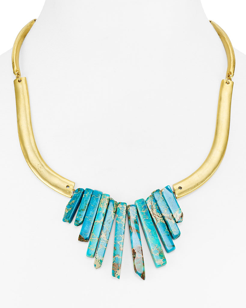 Every so often a necklace is designed that draws inspiration from the world around us and creates an unforgettable moment. This magnificent statement stands on its own, celebrating the dynamic energy and beauty of nature. It utilizes subtle curvature, rich gold hues and stunning blue turquoise howlite stones. Finished with our trademark "S" hook closure.