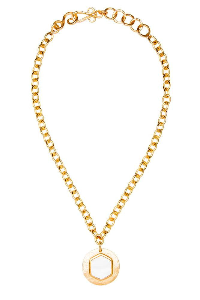 A luxe base of 24K gold plate is shaped into a hexagonal motif and punctuated with a Mother of Pearl stone. The mixture of shapes and textures turn this classic style into a modern statement.