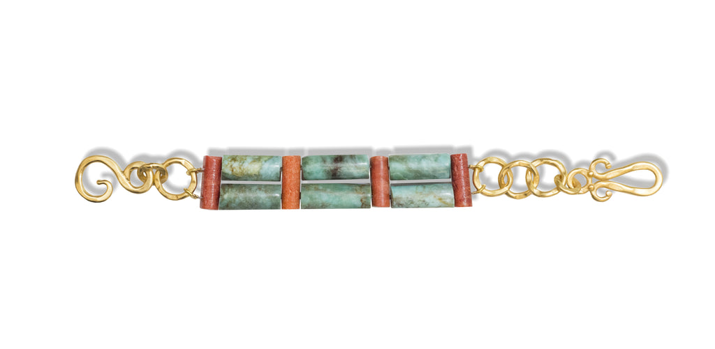 A sublime combination of turquoise and coral creates a breathtaking statement. Gold hardware ties in the color story with an air of effortless natural luxury. The piece is finished with our trademark "S" hook closure.