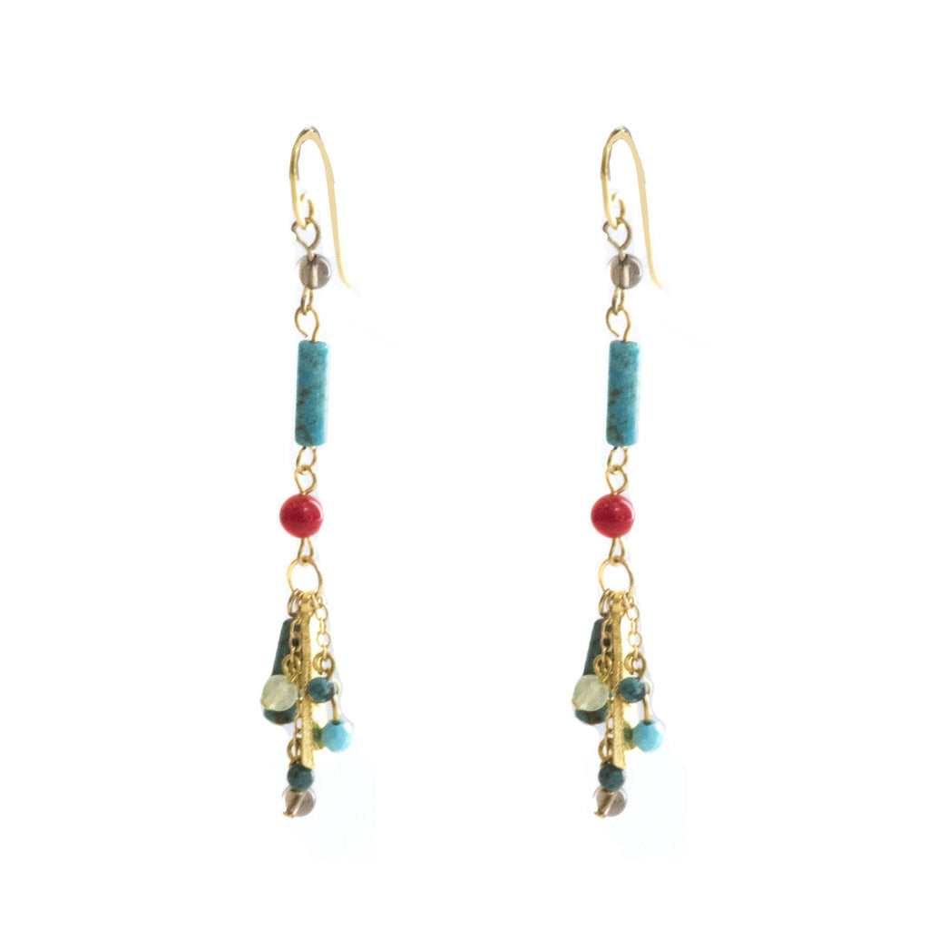 Add some color to your spring wardrobe with this dazzling dangle earring. A stunning combination of turquoise and coral create a bright and festive accent. A mixture of beads are suspended from gleaming gold chain.