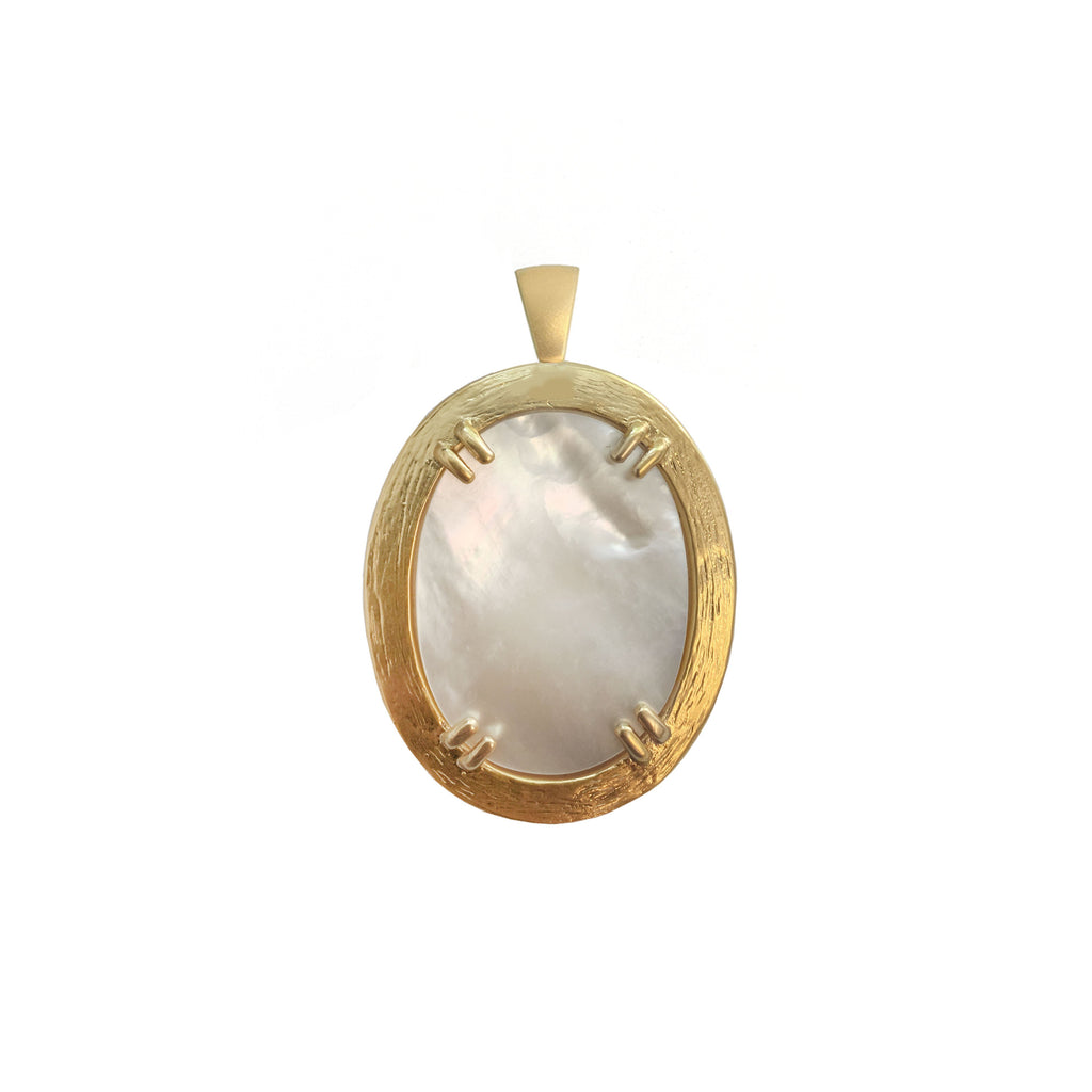 Life is a celebration of beauty, and this pendant proves it. A round base of gold plate absorbs a Mother of Pearl stone. Delicate, antique-inspired prongs hold the stone in place. All of our pendants can be used to customize our signature "S" hook chains.
