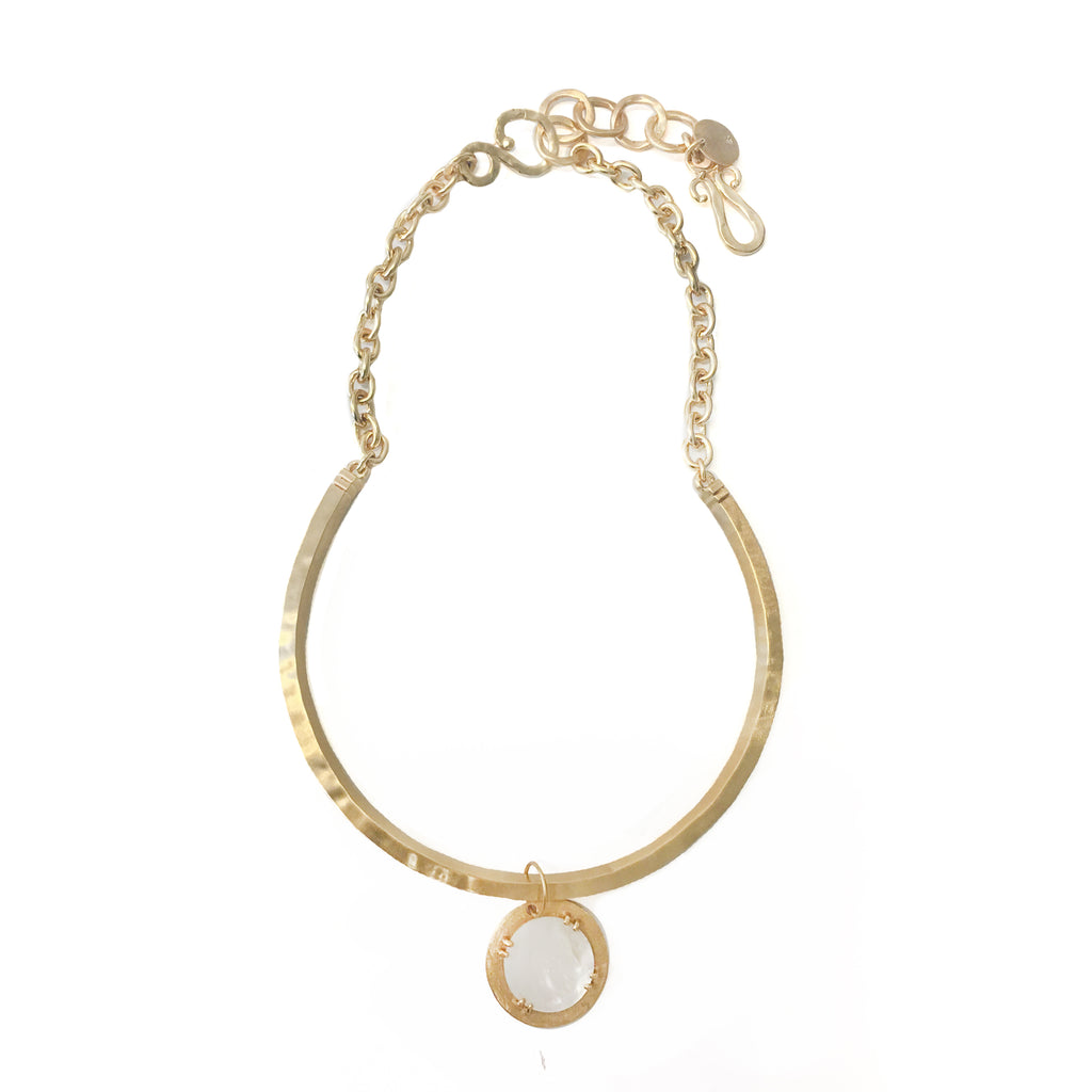 An elegant design rendered by the fluidity and ease of curves, this necklace is an instant favorite. A smooth Mother of Pearl stone is embraced by a base of 18K yellow gold plate at its center. It feels wholly modern, yet resembles intriguing adornments of centuries past.