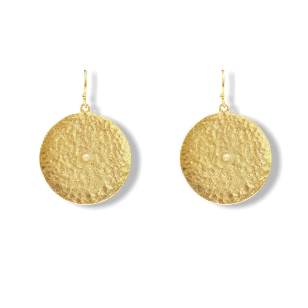 Classic hammered round Paris forms are used to create a chic modern earring with a twist. This eye-catching style, crafted in 18K gold plate, shines with looks both casual and elegant. A hint of movement allows them to catch the light as you wear them.