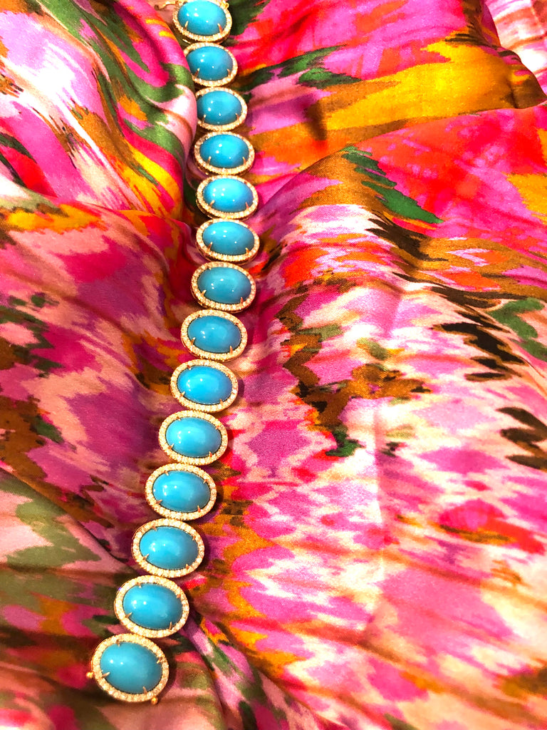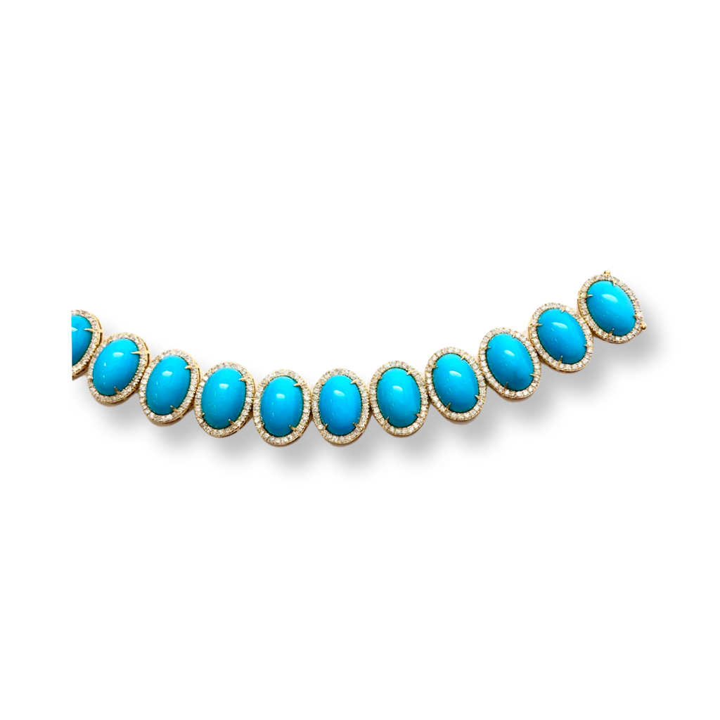 Adorn your wrist with timeless elegance with this exquisite Turquoise bracelet. Crafted with 18K Gold and set with glimmering diamonds, the oval shape and Sleeping Beauty Turquoise together create an alluring contrast. A truly luxurious statement piece!