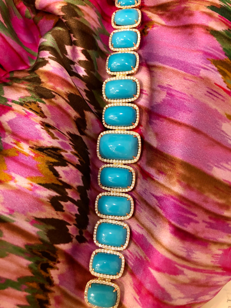 This Bridge Turquoise & Diamond 18K Yellow Gold Bracelet is the bridge between bling and chill. With its Sleeping Beauty turquoise, 18K yellow gold architecture, and sparkly diamonds, you can look like a million bucks without taking yourself too seriously. Cross over to blissful style!