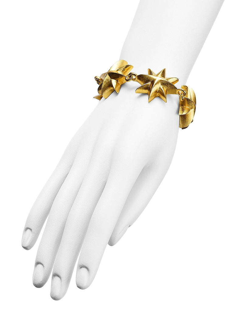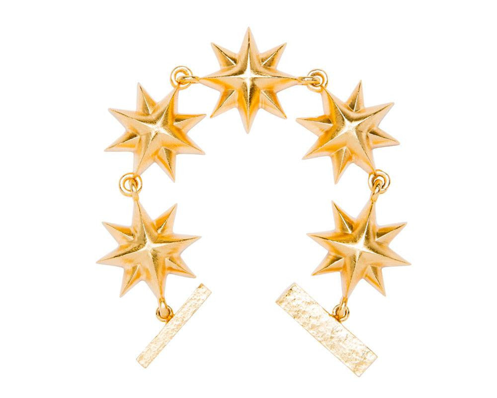 Our signature Sunburst designs honor our brand's anniversary and mission of invoking a sense of power and intrigue with each piece of jewelry we create. A row of sunburst motifs are crafted in gleaming gold plate.
