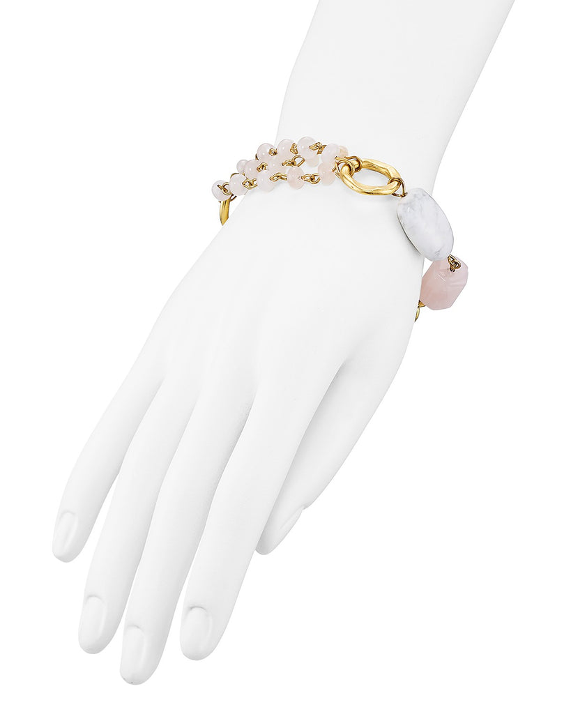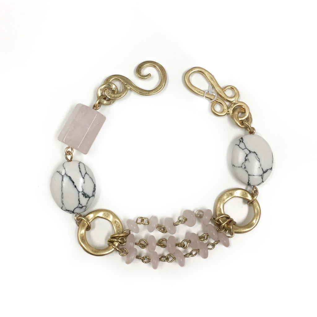 If your spring wardrobe needs a touch of elevated color and whimsy, this is the perfect bracelet. A mixture of rose quartz, howlite and 18K gold plate are combined to achieve this romantic, playful effect.