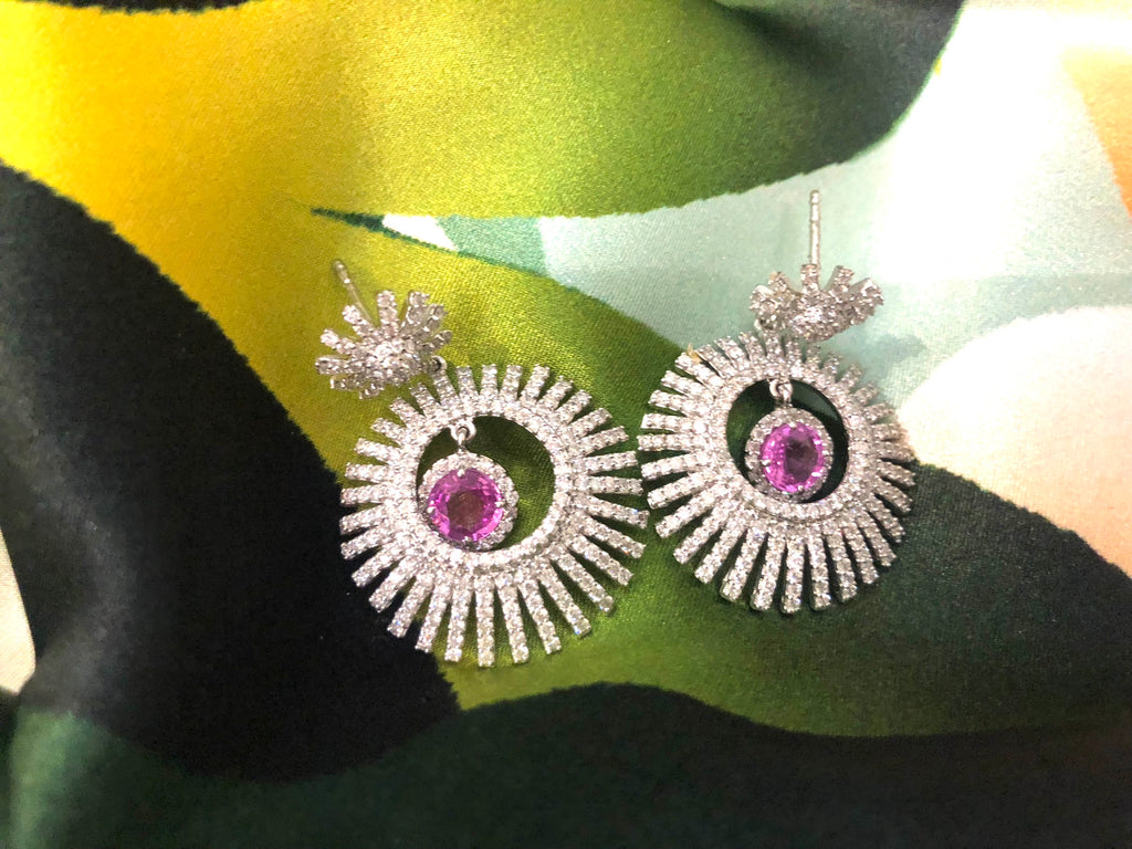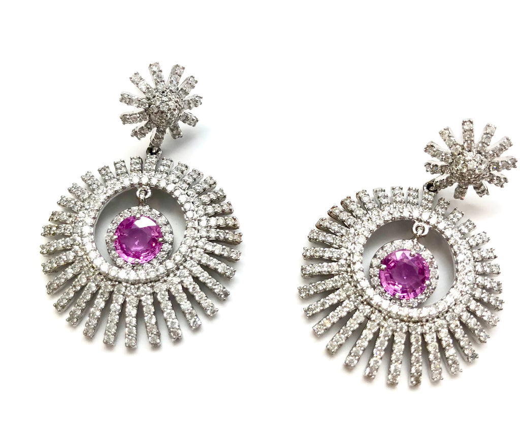 These Circular Diamond and Pink Sapphire Earrings are the perfect accessory to any luxurious evening look. Crafted with gold and draped in beautiful pink sapphires, diamonds glisten like the stars of a midnight sky. With an alluring circular motion, these timeless earrings are sure to bring a special sparkle to your wardrobe.