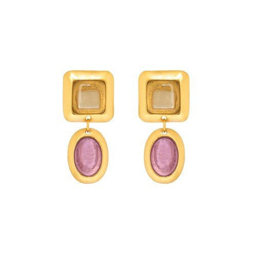 Our polished gold plated square-shaped earrings give way to dangling ovals, both elements emblazoned with white quartz and light amethyst stones. Capture a sense of luxury in your look when you add these special pieces.