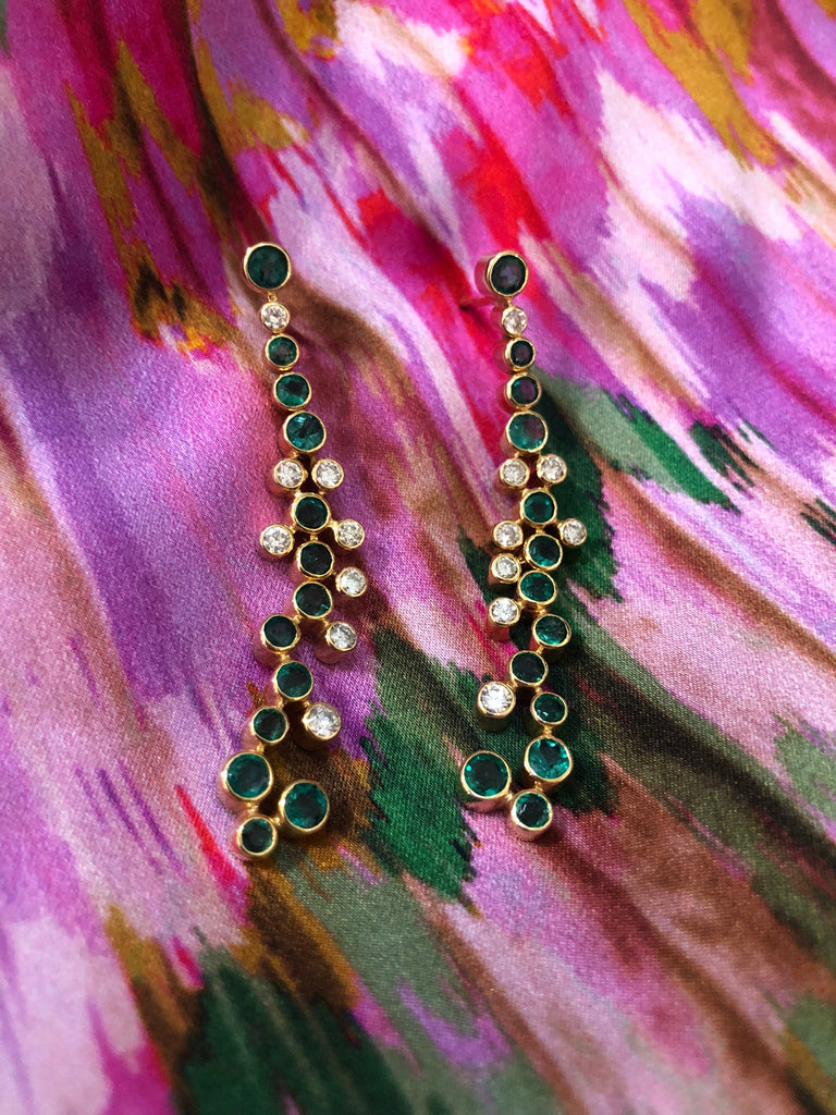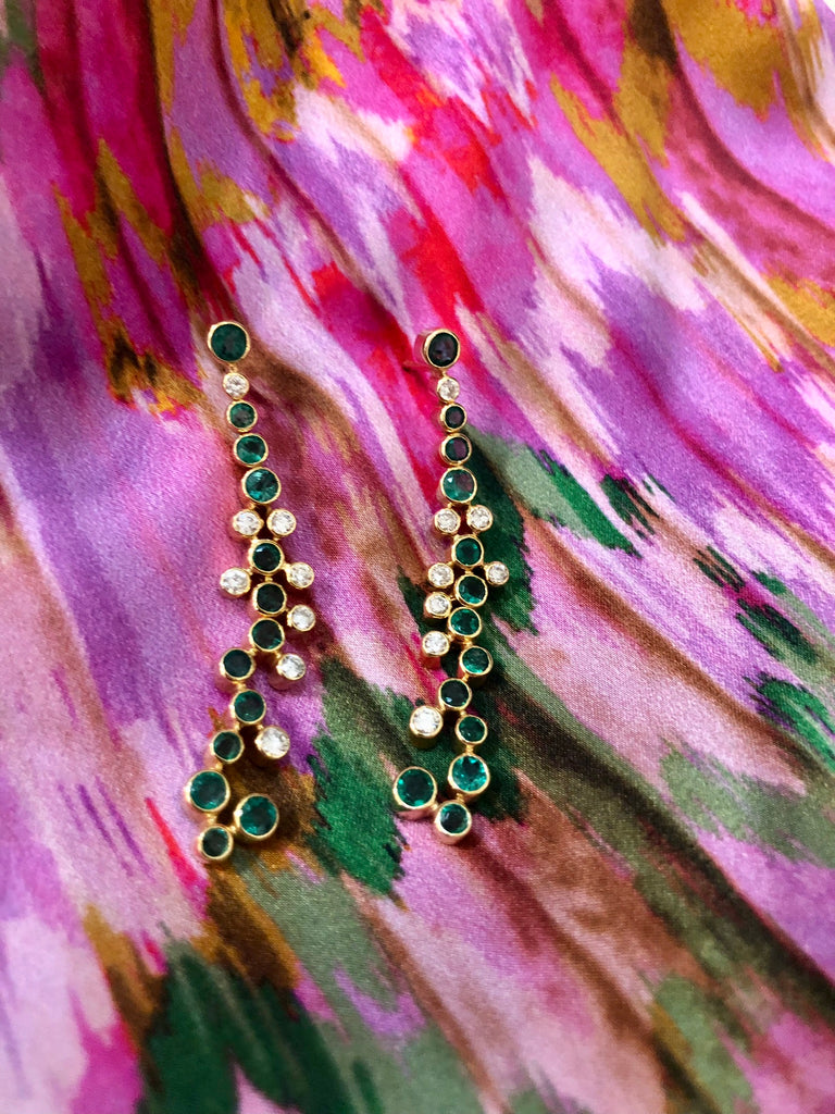 These earrings feature shimmering bubbles of emerald and diamond - a perfect combination that exudes elegance and refinement. The beautiful gems dance and sparkle in the light, creating a look of timeless sophistication.