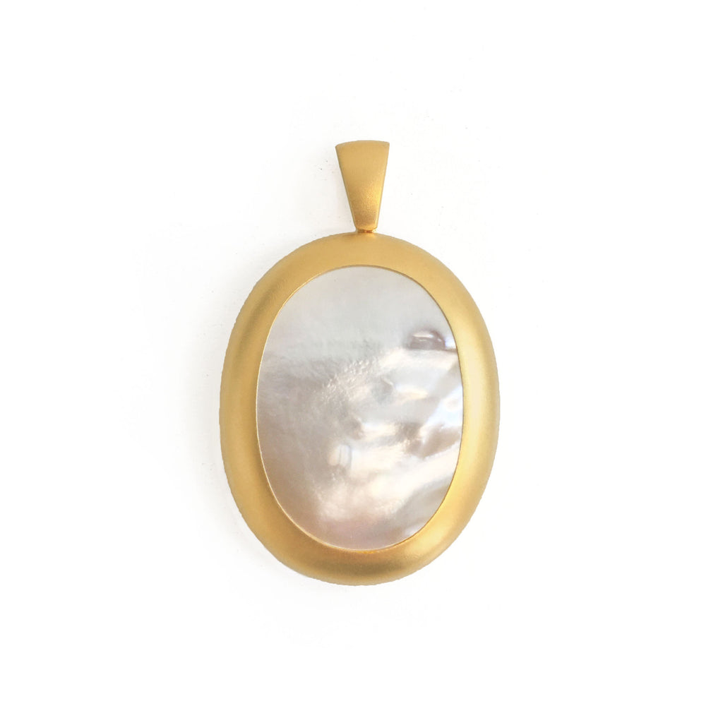A Mother of Pearl center shines at the center of this radiant pendant, featuring a base of 18K yellow gold. It embodies a sense of regal charm while maintaining a decidedly modern aesthetic. All of our pendants can be used to customize our signature "S" hook chains.