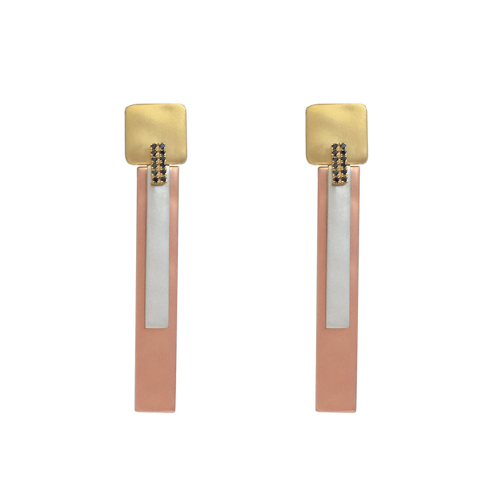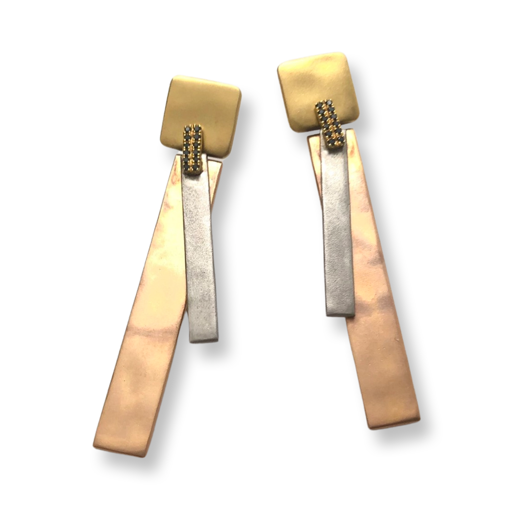 The best designs draw from the essence of the past while embodying chic, modern sensibilities. These earrings represent the forward motion of design and the evolution of beauty. An elegant mix of metals includes 18K yellow gold, rose gold and sterling silver with a dusting of black diamonds.