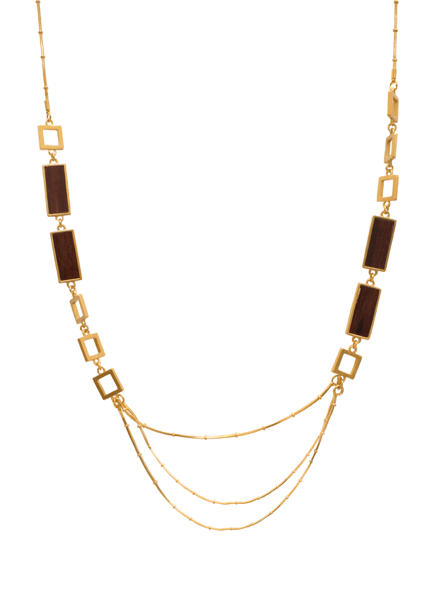 Make a statement with multiple layers of ornate chains, accented with the natural, unexpected element of wooden beads. A full 42" of gold plated links gleam and cascade into a triple tier statement.